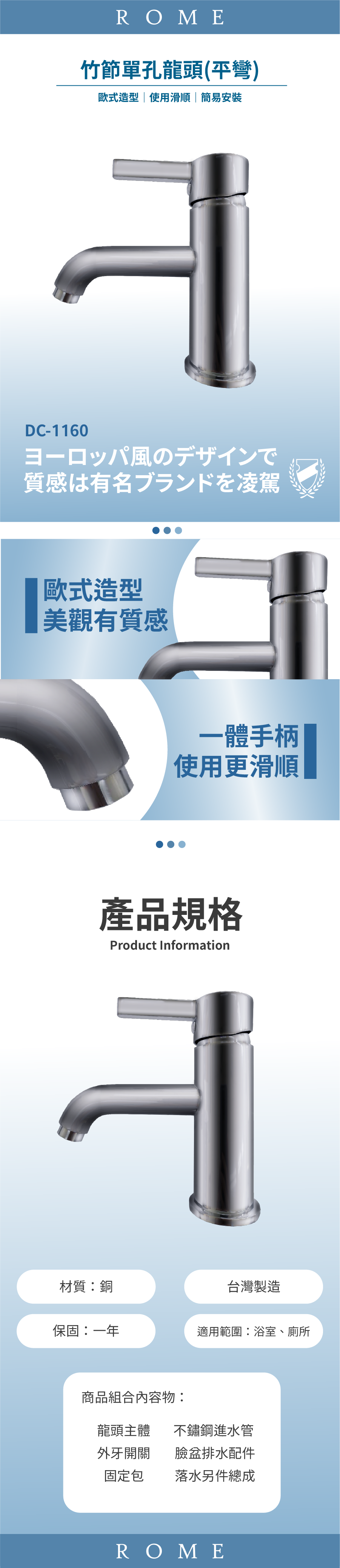 組合內容物:龍頭主體、外牙開關 固定包、不鏽鋼進水管、臉盆排水配件、 落水另件總成