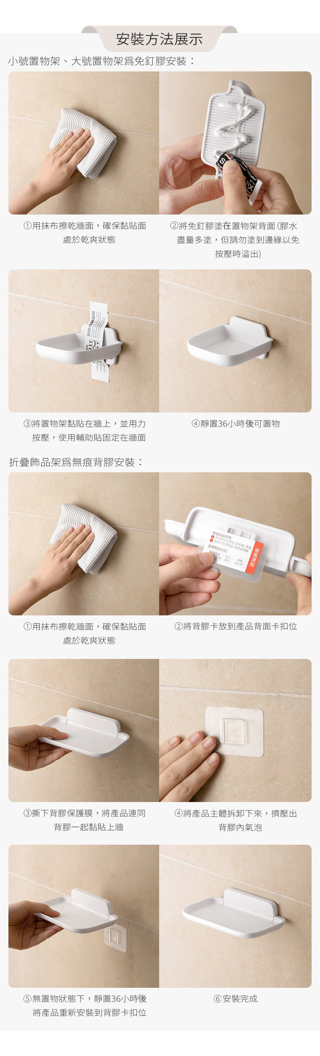 ● 免釘膠適用牆面:光滑磁磚面、光滑大理石面、光滑金屬面、硬質玻璃面