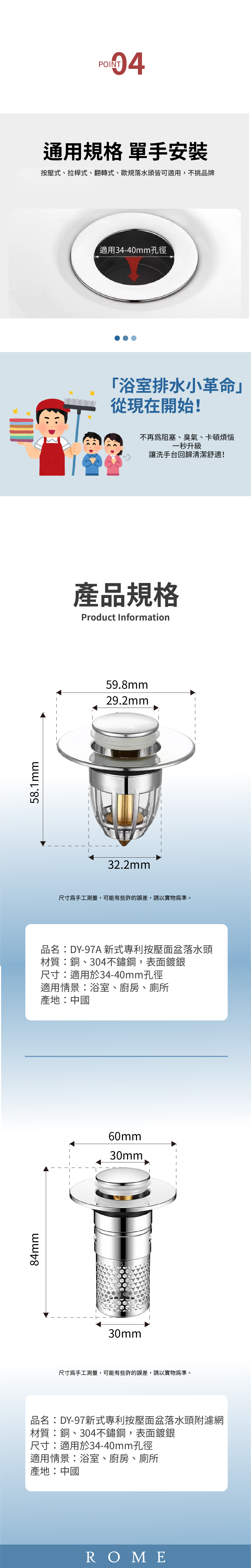 ✔ 通用規格,單手安裝——按壓式、拉桿式、翻轉式、歐規落水頭皆可適用,不挑品牌