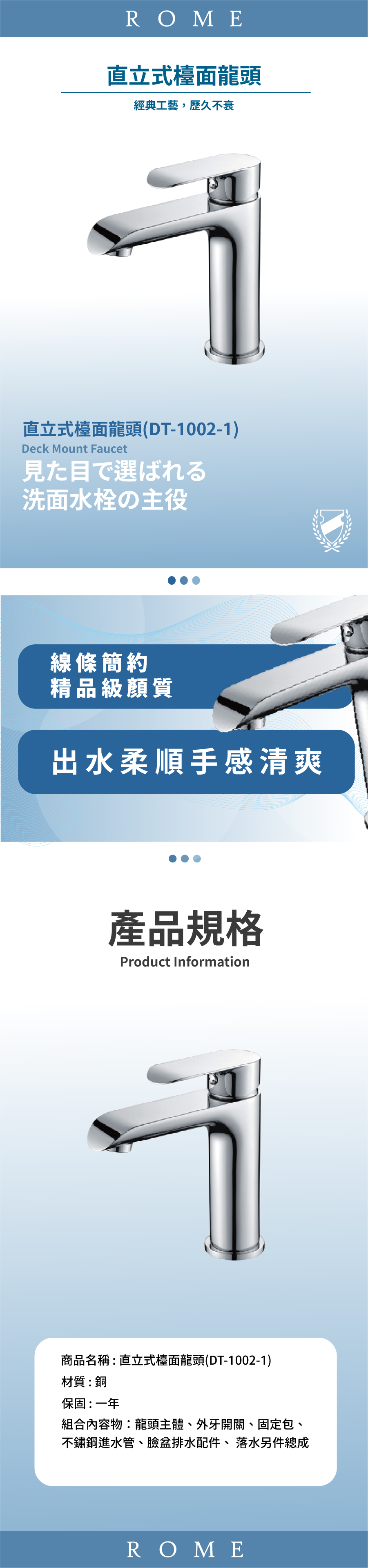 組合內容物:龍頭主體、外牙開關、固定包、不鏽鋼進水管、臉盆排水配件、 落水另件總成