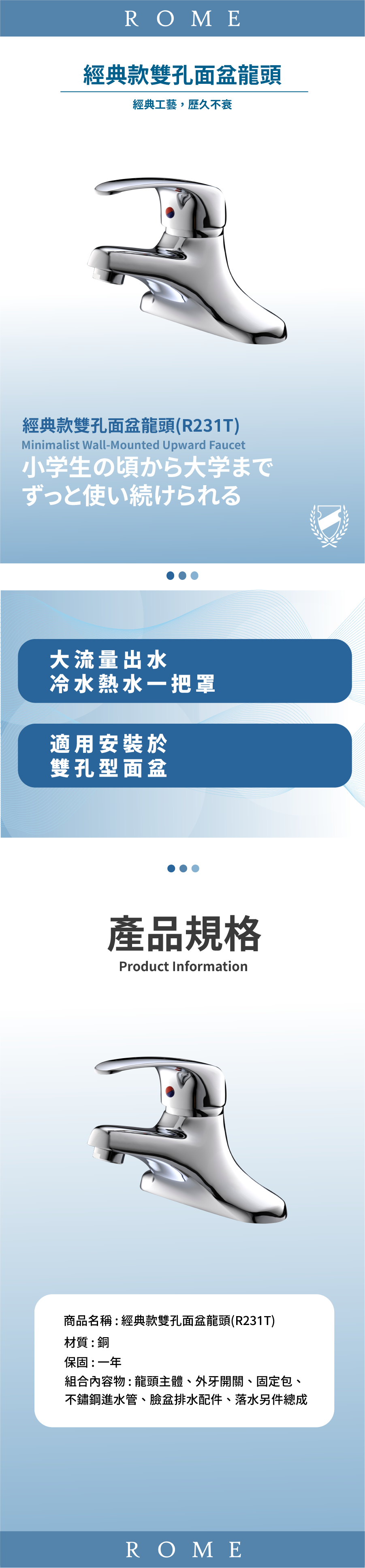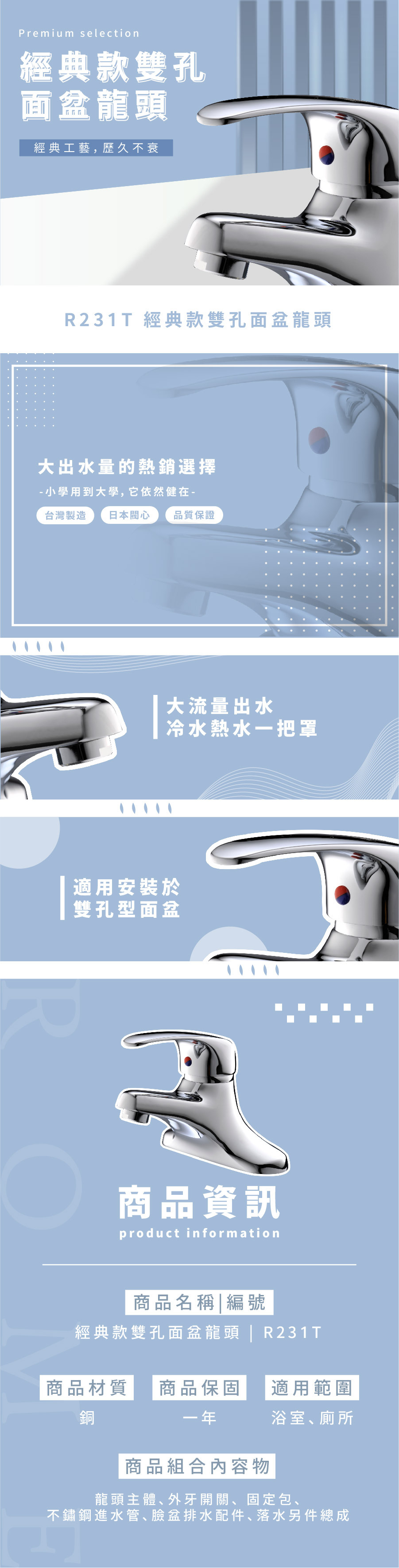 組合內容物:龍頭主體、外牙開關、 固定包、不鏽鋼進水管、臉盆排水配件、落水另件總成