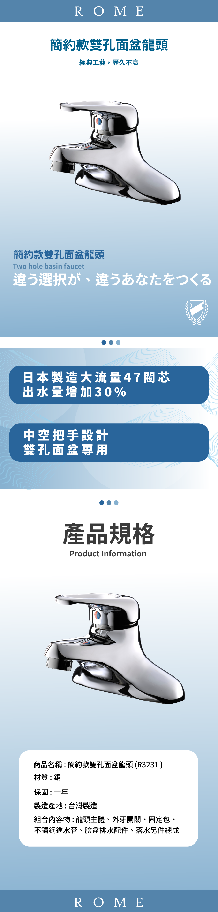 ● 主體搭配日本製造大流量47閥芯,出水量增加30%