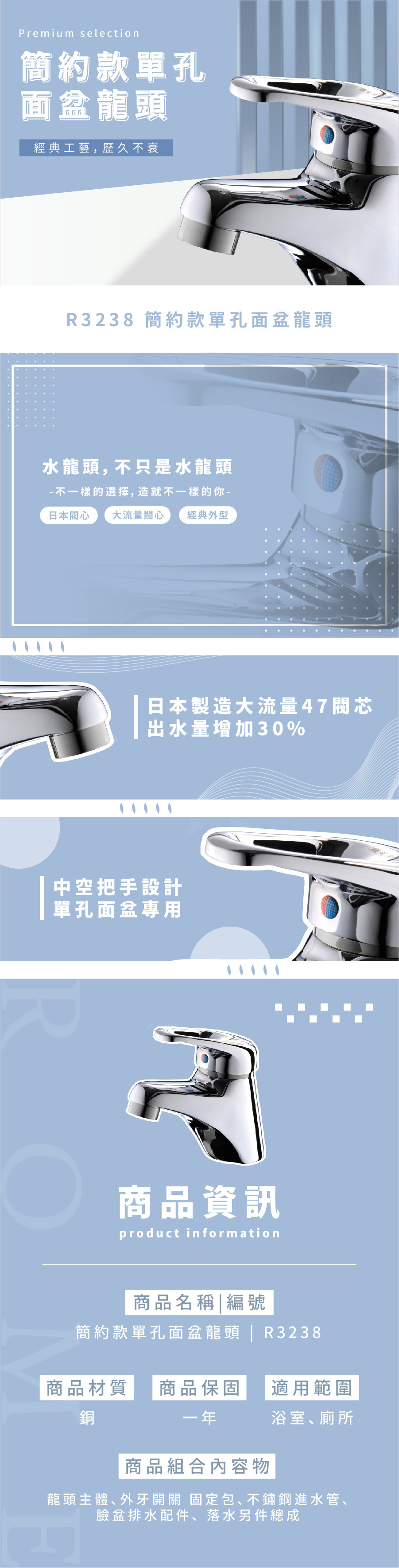 組合內容物:龍頭主體、外牙開關 固定包、不鏽鋼進水管、臉盆排水配件、 落水另件總成