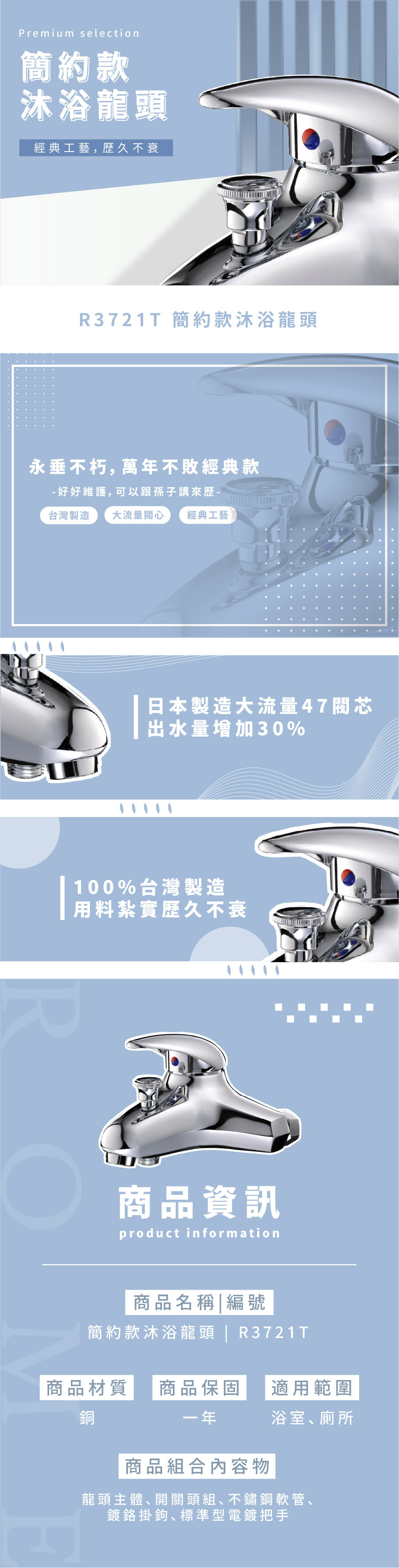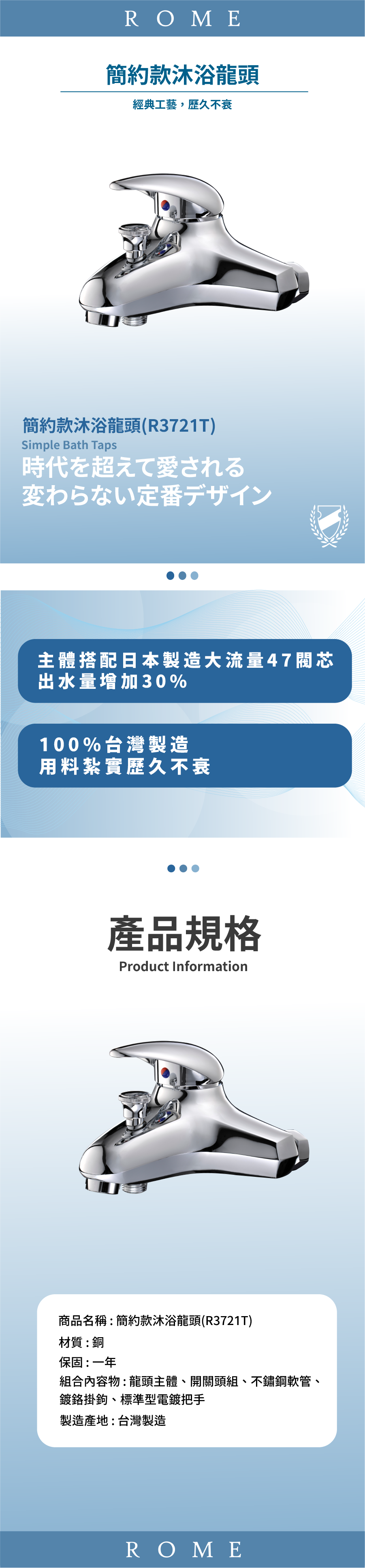 組合內容物:龍頭主體、開關頭組、不鏽鋼軟管、鍍鉻掛鉤、標準型電鍍把手