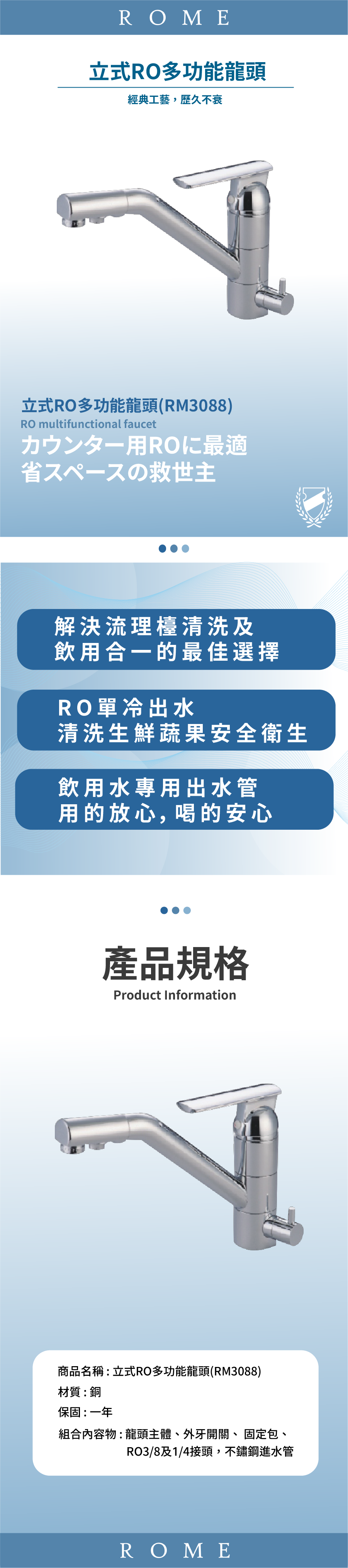 組合內容物:龍頭主體、外牙開關、 固定包、RO3/8及1/4接頭,不鏽鋼進水管