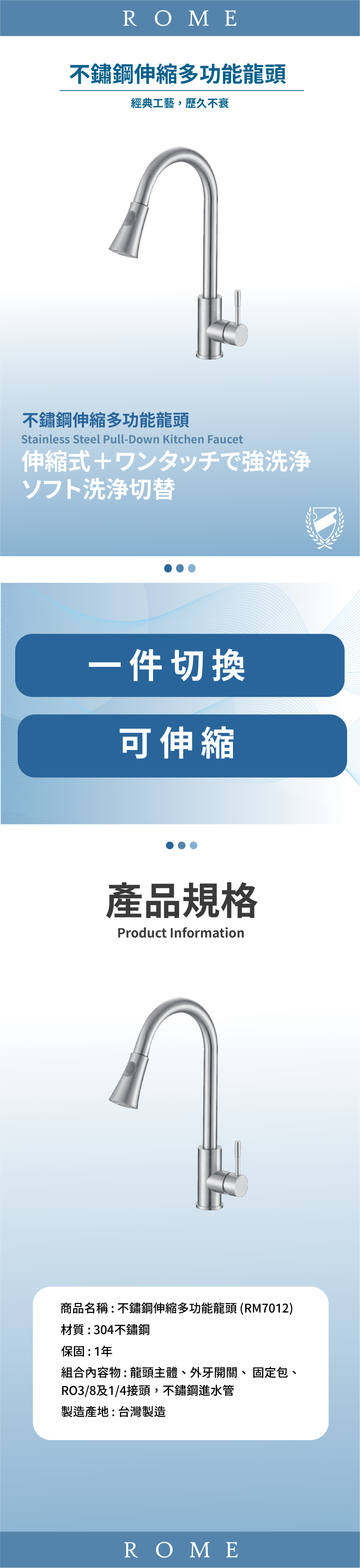 組合內容物:龍頭主體、外牙開關、 固定包、RO3/8及1/4接頭,不鏽鋼進水管