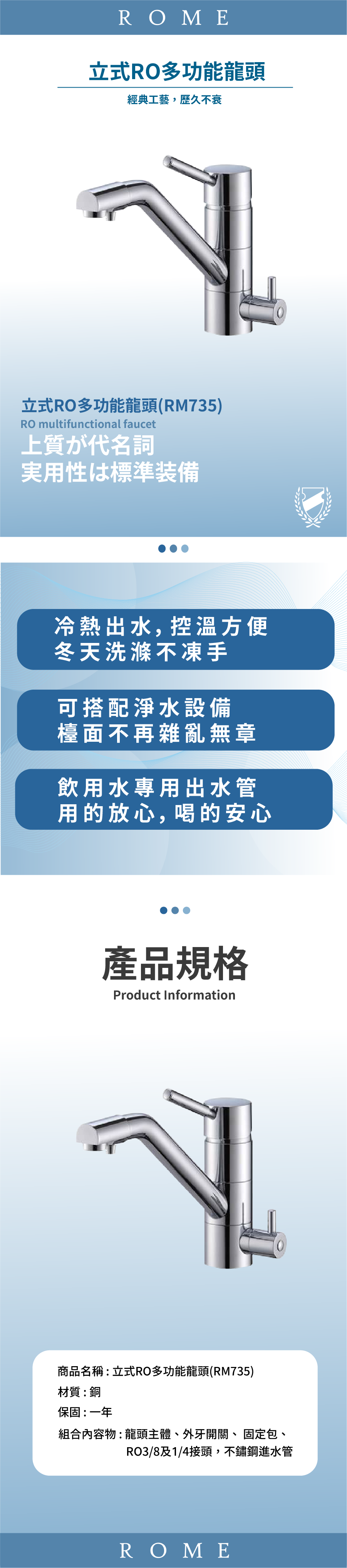 組合內容物:龍頭主體、外牙開關、 固定包、RO3/8及1/4接頭,不鏽鋼進水管