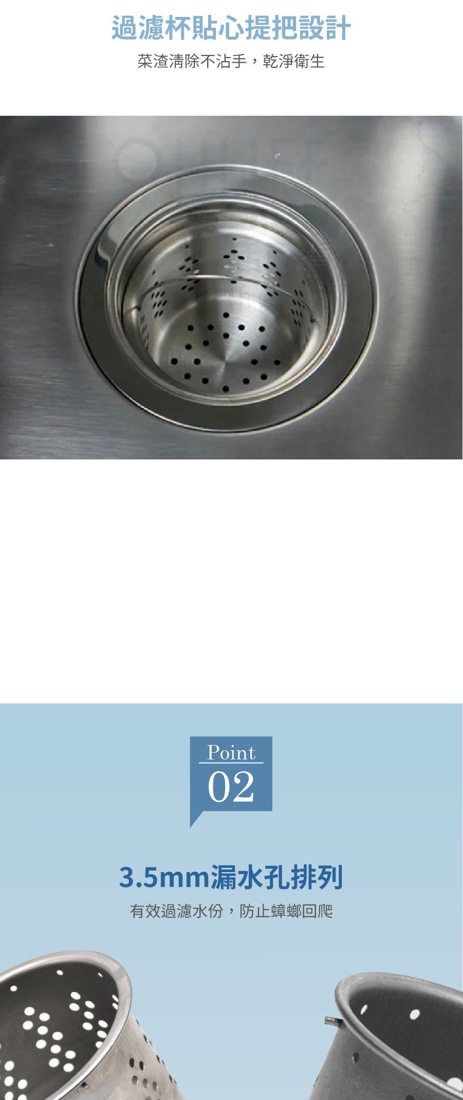 ● 3.5mm漏水孔排列,有效過濾水份,防止蟑螂回爬