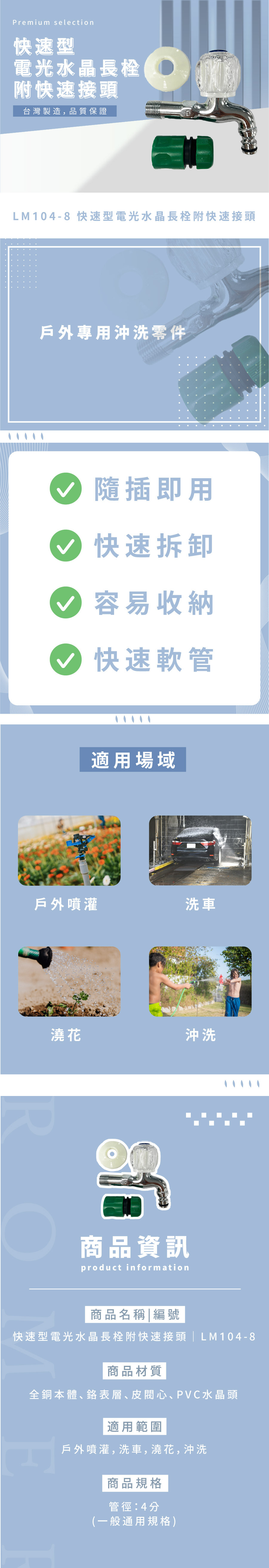 ● 針對戶外噴灌,洗車,澆花,沖洗,專用的快速接頭長拴