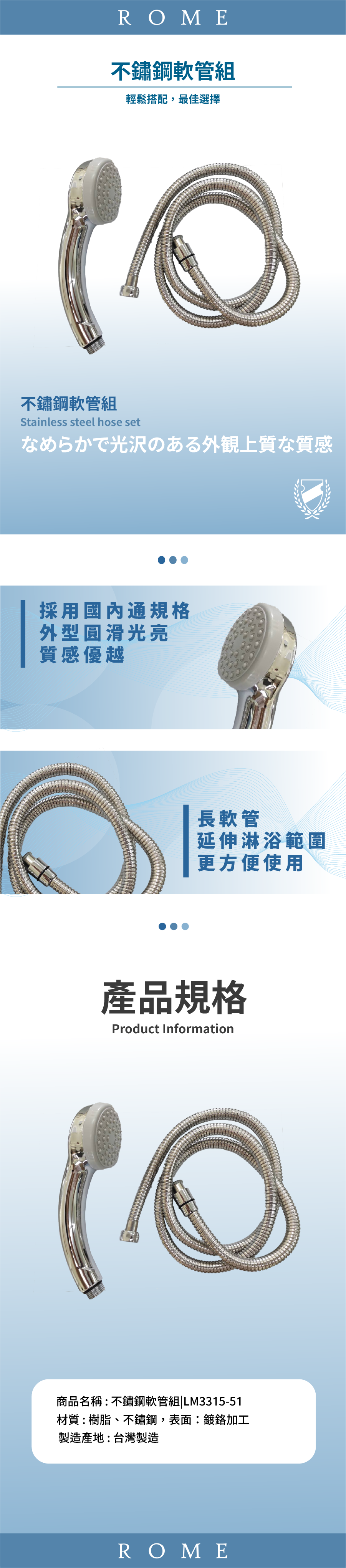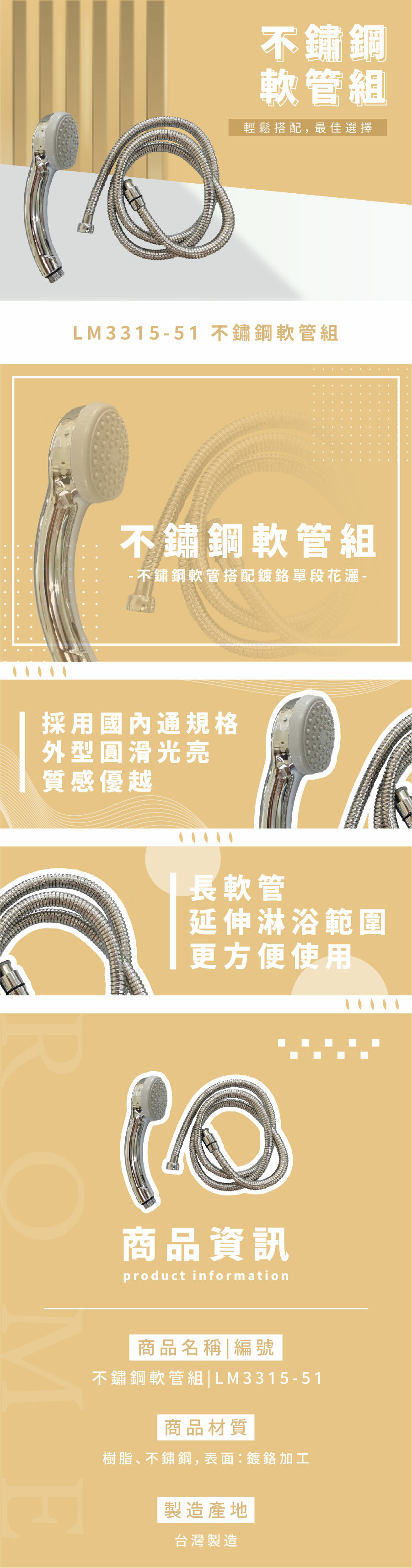 ● 長軟管,延伸淋浴範圍,更方便使用