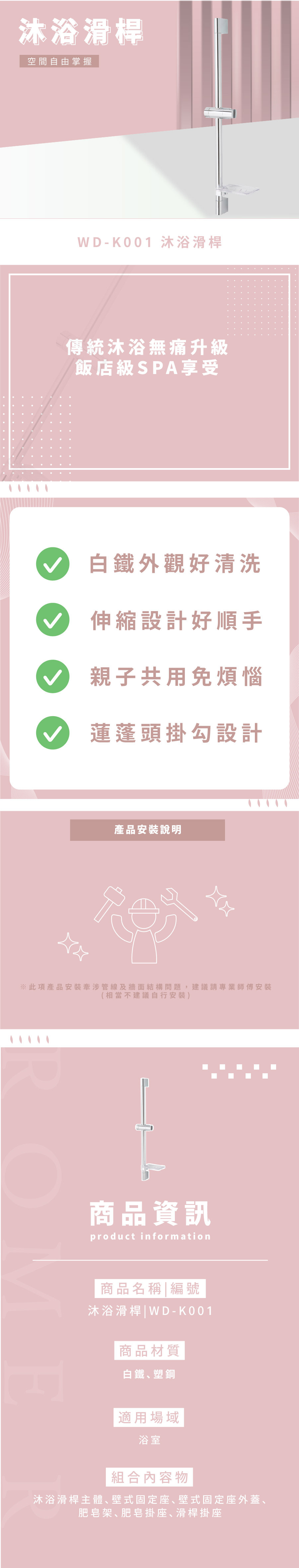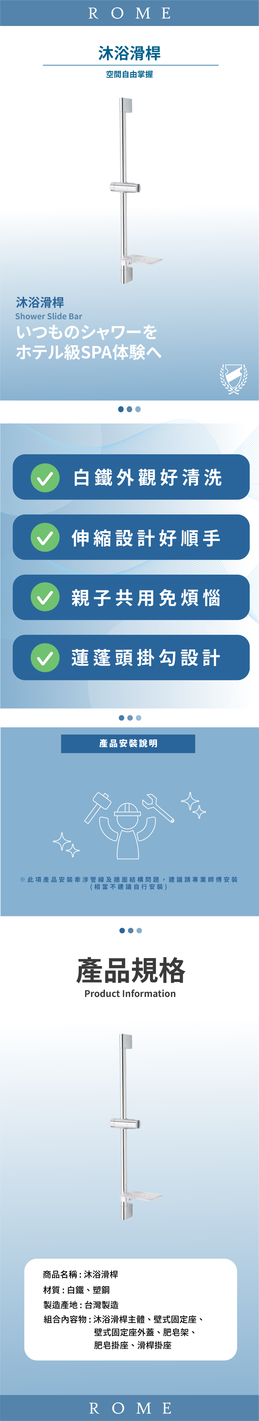 組合內容物:沐浴滑桿主體、壁式固定座、壁式固定座外蓋、肥皂架、肥皂掛座、滑桿掛座